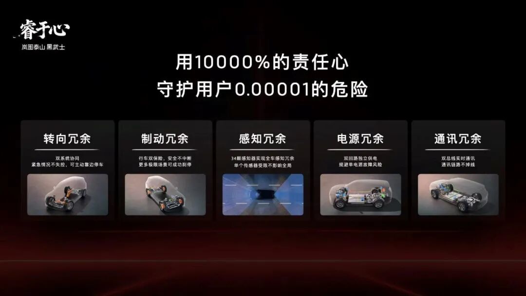 这套智驾系统的落地,源于岚图与华为在高阶智驾领域的深度合作,双方在高精度感知硬件、智驾系统适配层面形成了技术互补。而在底层架构上,岚图泰山Ultra基于具备L3技术能力的天元智能架构开发,搭配自主研发的青云行驶平台,配备了转向、制动、感知、通讯、电源五大维度的安全冗余设计,通过多重备份机制满足L3有条件自动驾驶的安全要求。
