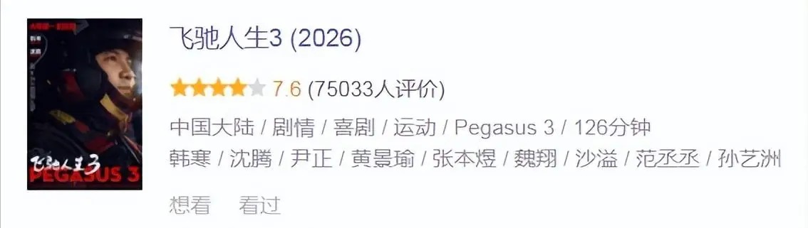 倒不是说《飞驰人生3》已经达到去年《哪吒之魔童闹海》那样的高度,而是今年春节档影片整体表现较弱,还没有能与《飞驰人生3》相抗衡的片子。豆瓣开分7.6,也是春节档目前最高的影片,且与前作分数持平,可见韩寒的表现相当稳定。