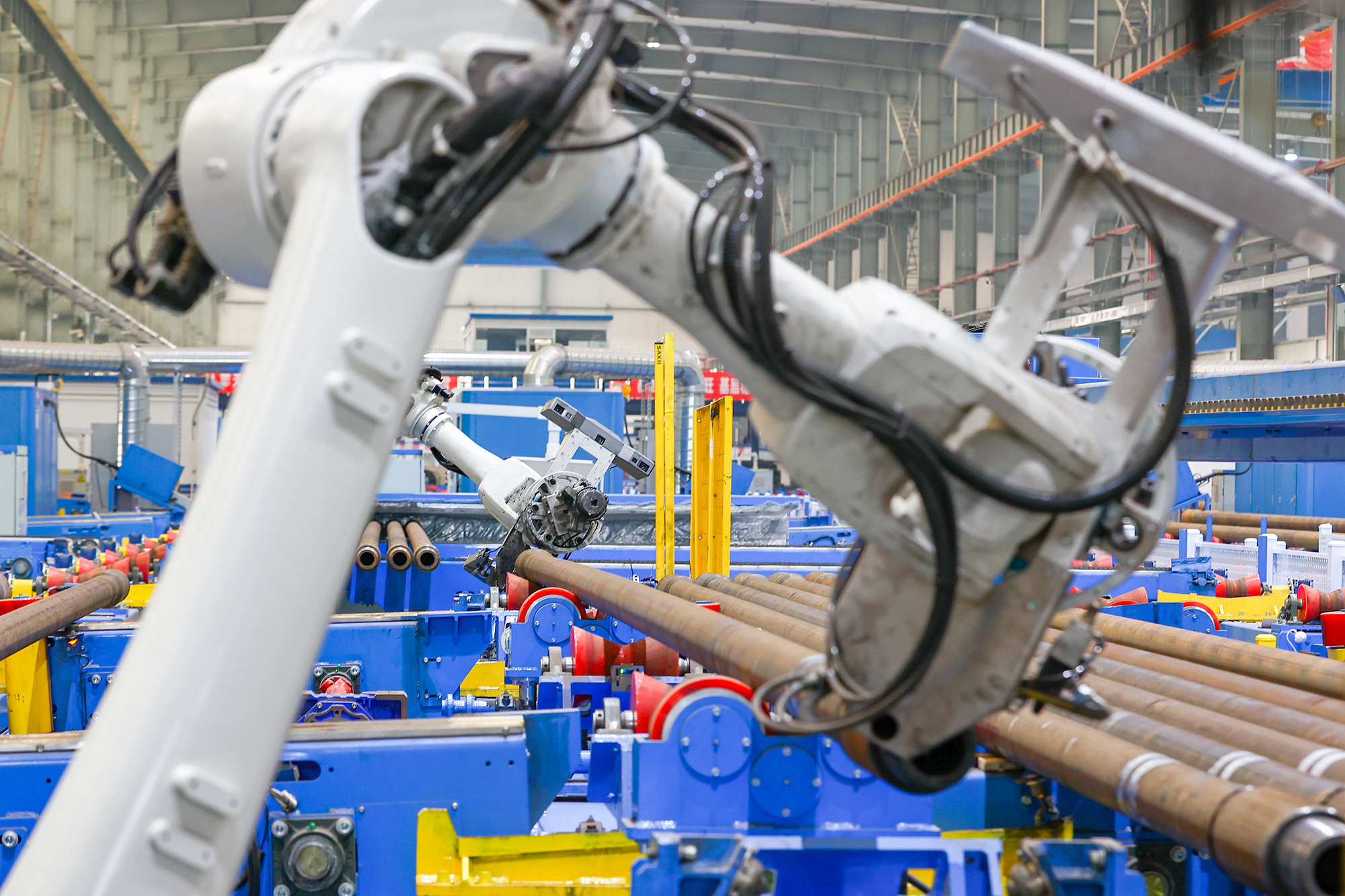3月17日,在中海油服钻井事业部钻具检维修自动化车间,机械臂对钻杆进行保养。