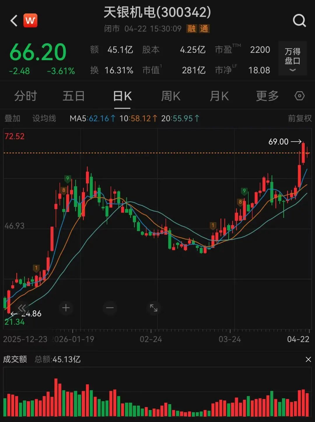 4月22日晚,天银机电披露的2026年一季报显示,境内自然人刘鑫成为公司第三大股东,持股数约1418.61万股,持股比例3.34%。按天银机电今日66.2元/股的收盘价计算,相关股份价值约9.39亿元。